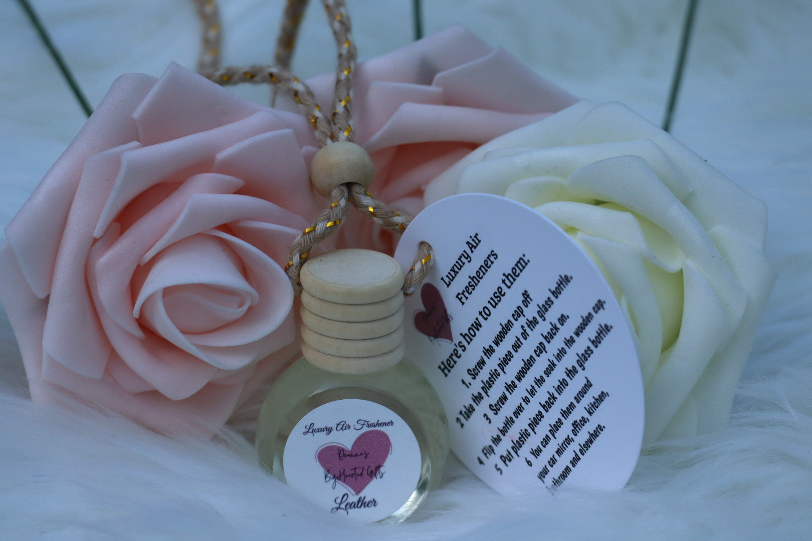 Portable, mini-size hanging glass bottles. All you need to do is put it upside down for a few seconds so the perfume absorbs into the cork. Then you can hang the bottle from the cord as a diffuser. The fragrance will emit slowly and will last a full month. It refreshes the air and creates a happy, relaxing feeling.